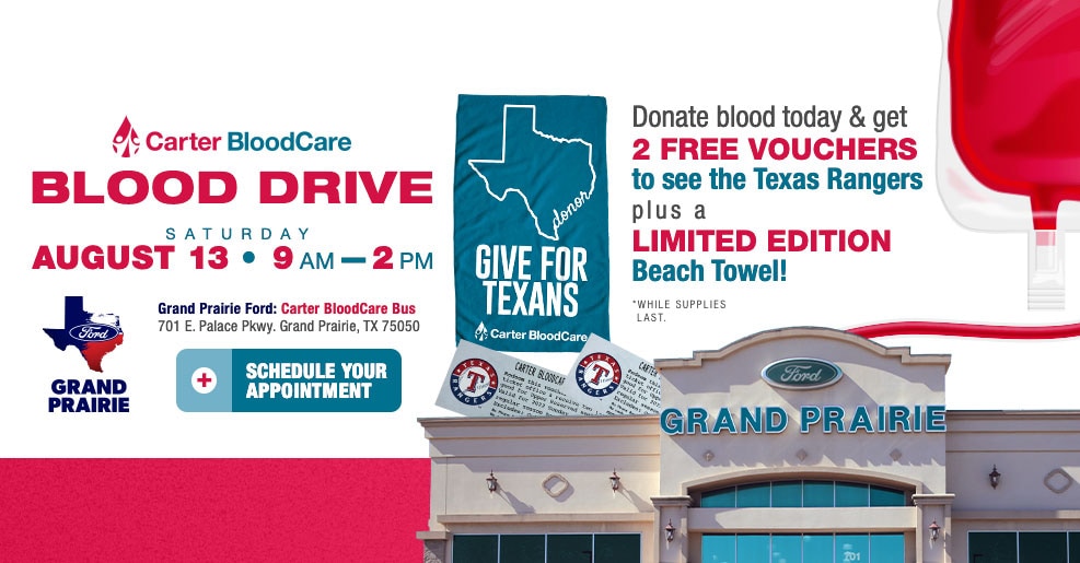 To help combat the national shortage of blood supply, Grand Prairie Ford will be hosting a blood drive on Saturday, August 13th, from 9:00 a.m. to 2:00 p.m.! The Carter Blood Drive staff and their bus will be on-site at our Grand Prairie Ford dealership to conduct the donations.